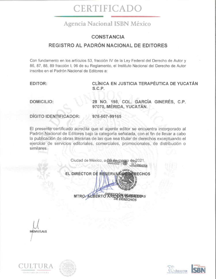 La Clínica en Justicia Terapéutica de Yucatán está registrada en el Padrón Nacional de Editores lo que nos permite publicar diferentes obras literarias.